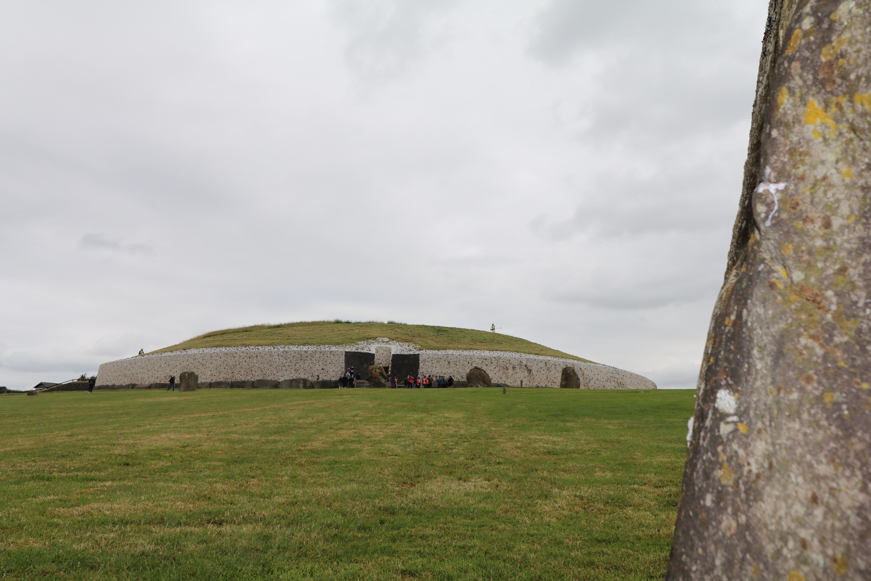 Let’s walk up the hill to the passage tomb and temple.img_0027 The entrance faces the rising sun. On the winter solstice, light enters the roof-box above the entrance, flashes down the narrow 60’ corridor and illuminates the back wall for seventeen minutes.img_0141 This engineering marvel measures 279’ wide, 39’ high, covering a little over an acre of land. Approximately 200,000 tons of rock, including a face of white quartz (collected from 25 miles to the south) and dark cobbled stone (collected from 25 miles to the north) outline the face of the temple.